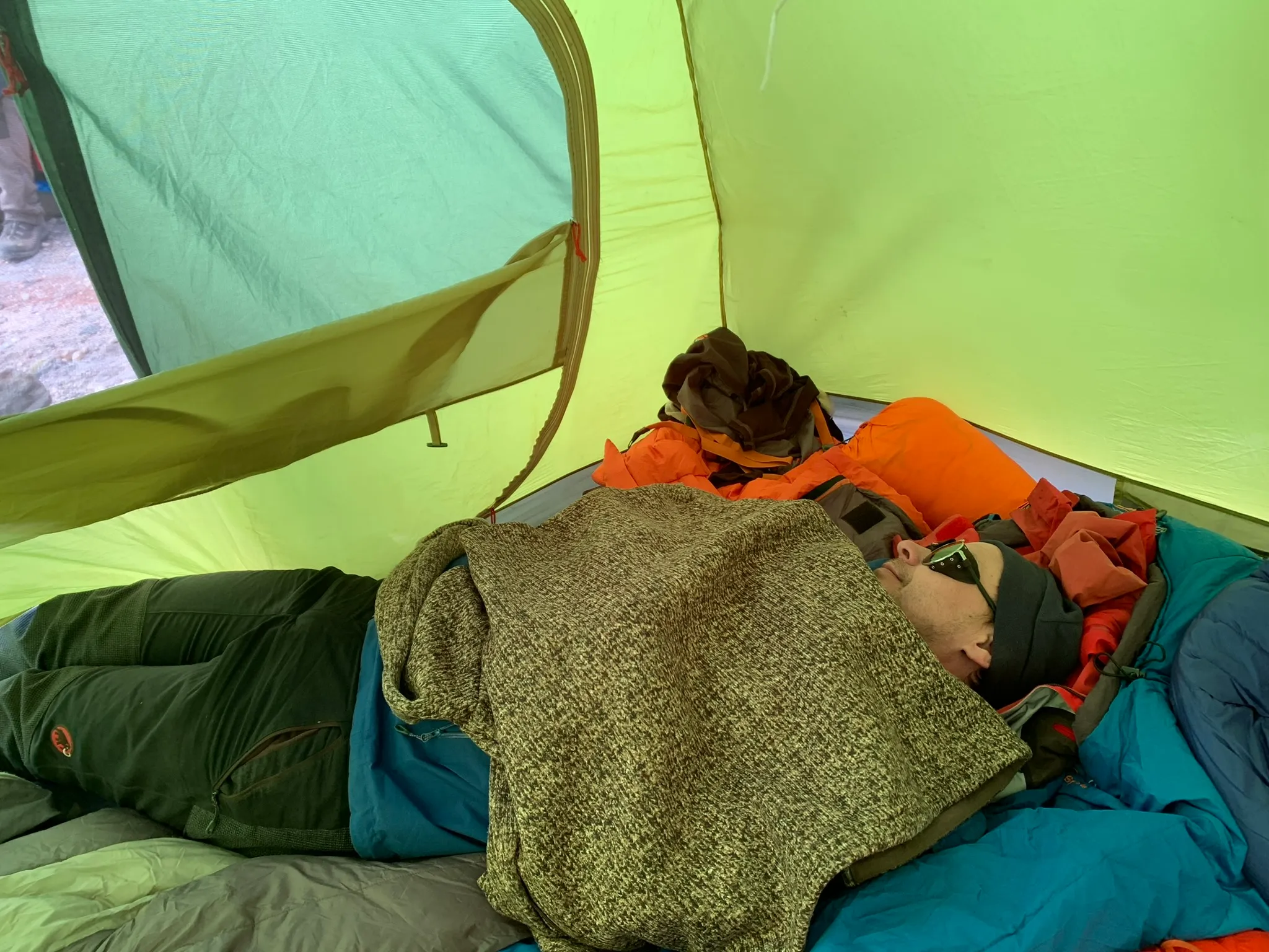 Pirmasis bandymas atrodė daug žadantis. Aklimatizacija ėjosi sklandžiai, komanda stipri, ritmas geras. Bet kuo aukščiau kopėme, tuo aiškiau jutome, kaip kalnas pradeda keistis. Iš pažiūros ramus dangus virto debesų siena, o paskutiniojoje stovykloje vėjas įsibėgėjo taip, kad palapinės virto įtemptais būgnais. Artėjant šturmo laikui, tapo akivaizdu: oras ne tik prastas — jis pavojingas. Sprendimas buvo sunkus, bet būtinas: apsisukti.