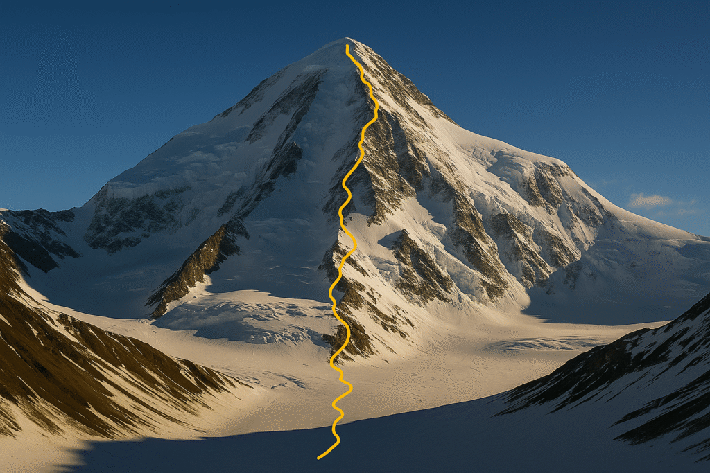 Vinson Massif, aukščiausias Antarktidos kalnas (4 892 m). Nuotrauka iš oro, matomas Branscomb ledyno maršrutas į viršūnę.